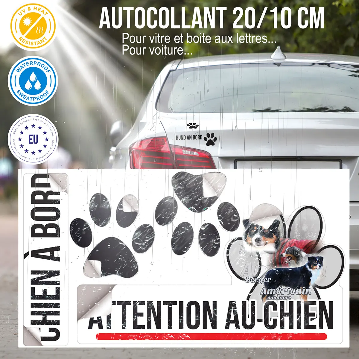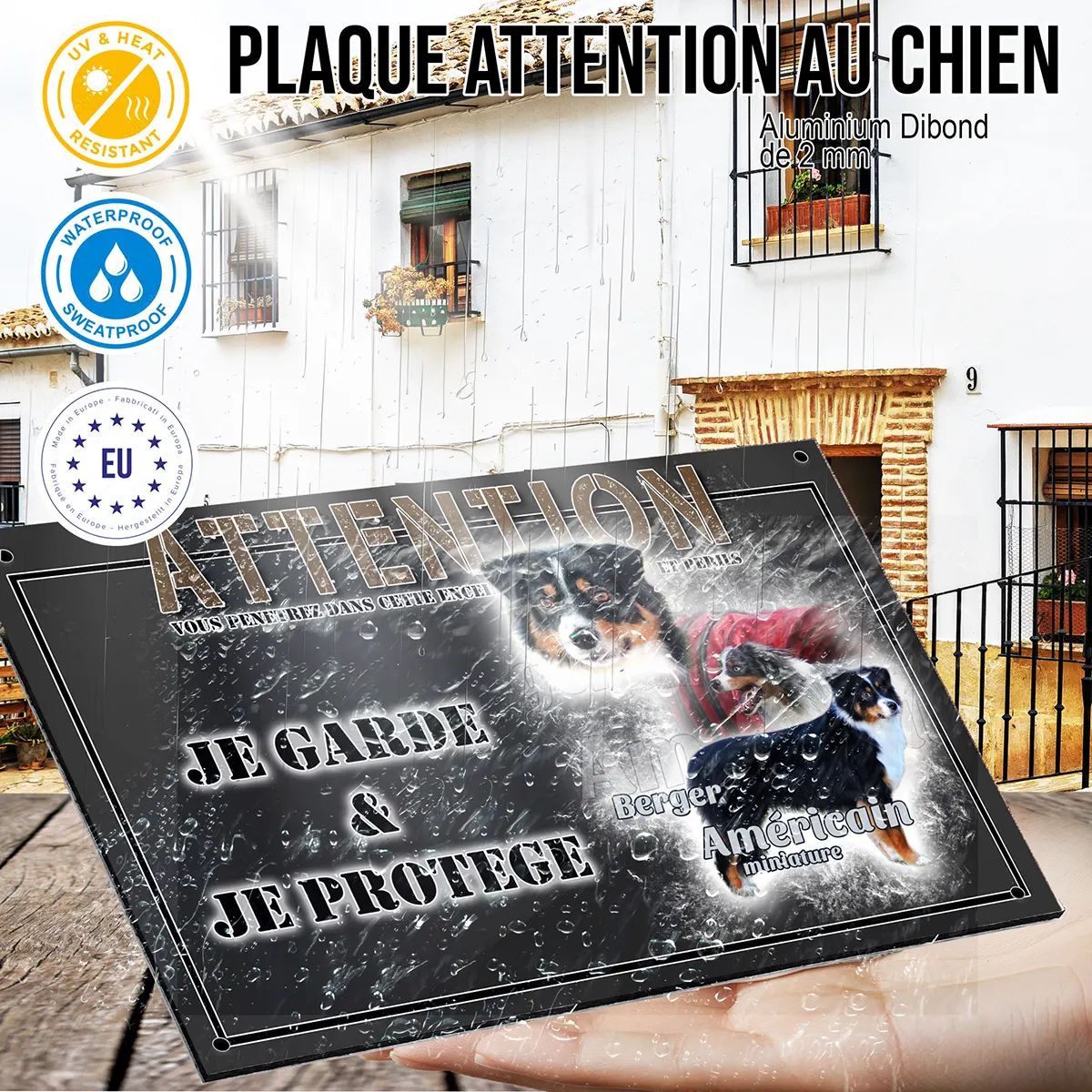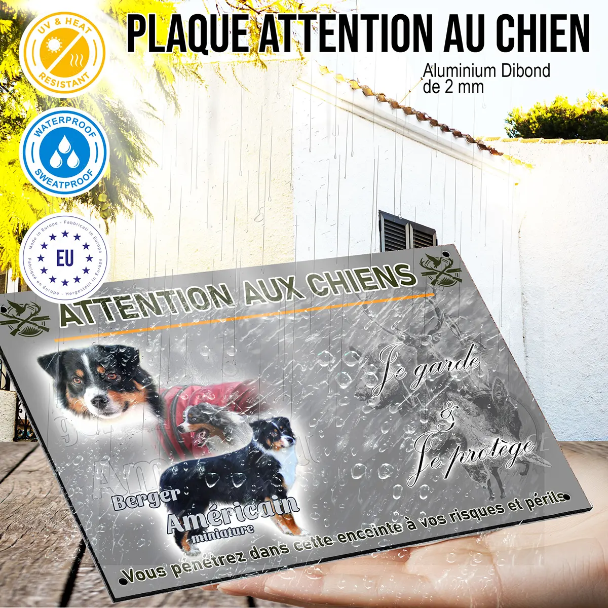 Installer une plaque Attention au chien avec l’effigie de ce chien emblématique allie efficacité et originalité. Le mini berger australien, grâce à son aspect alerte et sa capacité à surveiller son territoire, incarne la dissuasion parfaite contre d’éventuels intrus. Arborer une plaque illustrée de trois bergers américains miniatures en différentes poses met en valeur sa présence bienveillante et rappelle sa vigilance. Cette signalétique est essentielle pour prévenir les visiteurs et assurer la tranquillité de votre foyer.