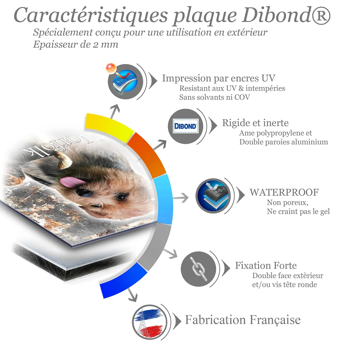 Oui, la plaque est fabriquée en aluminium Dibond de 2 mm et imprimée en UV. Elle ne craint ni la pluie, ni le soleil, ni le gel. Elle peut rester fixée dehors toute l’année sans perdre ses couleurs.