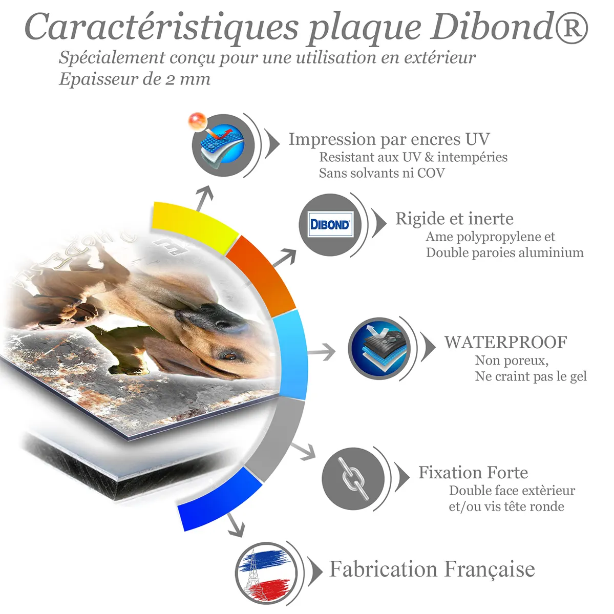 Oui, la plaque est fabriquée en aluminium Dibond de 2 mm et imprimée en UV. Elle ne craint ni la pluie, ni le soleil, ni le gel. Elle peut rester fixée dehors toute l’année sans perdre ses couleurs.