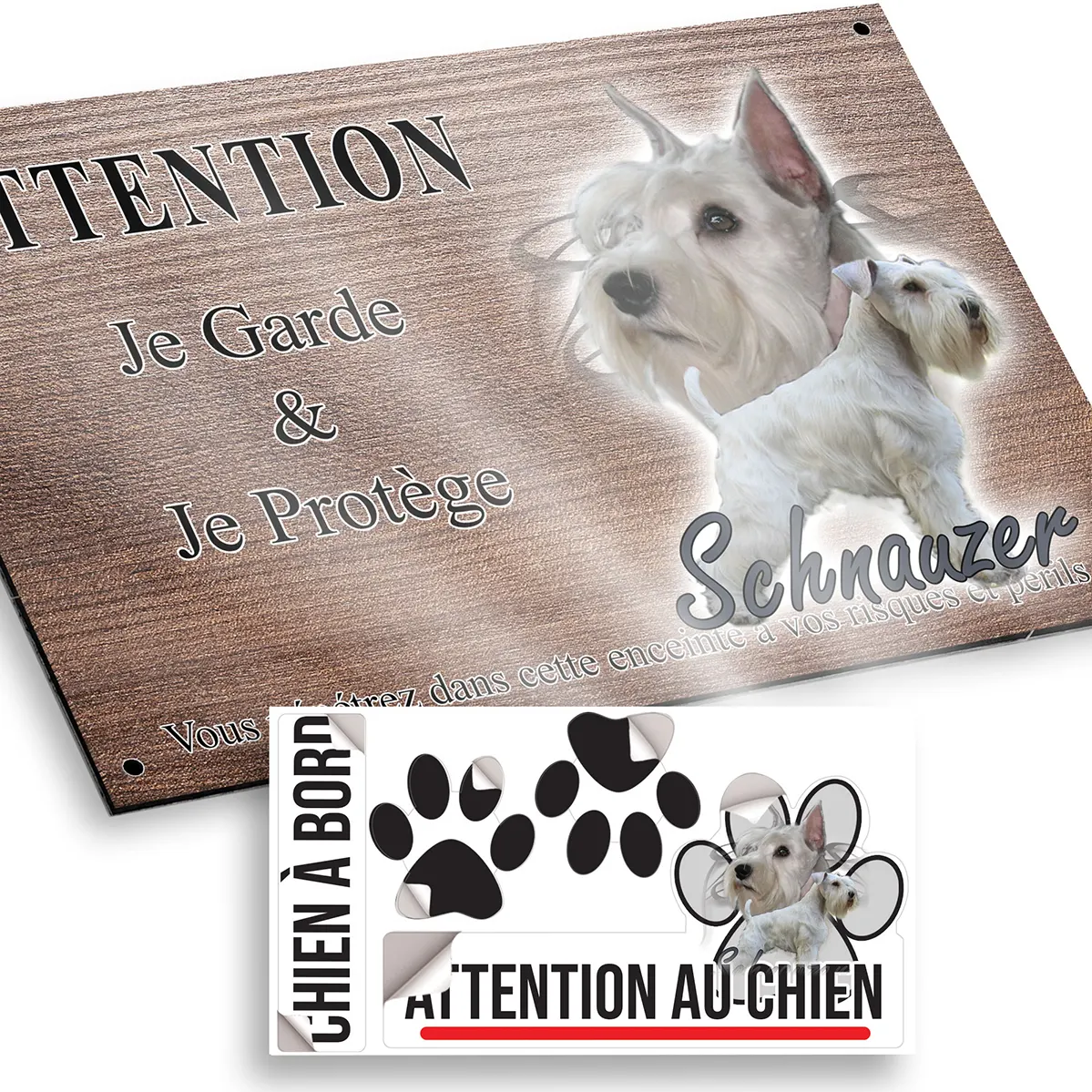 Pour en savoir plus sur notre gamme de plaque attention au chien schnauzer blanc