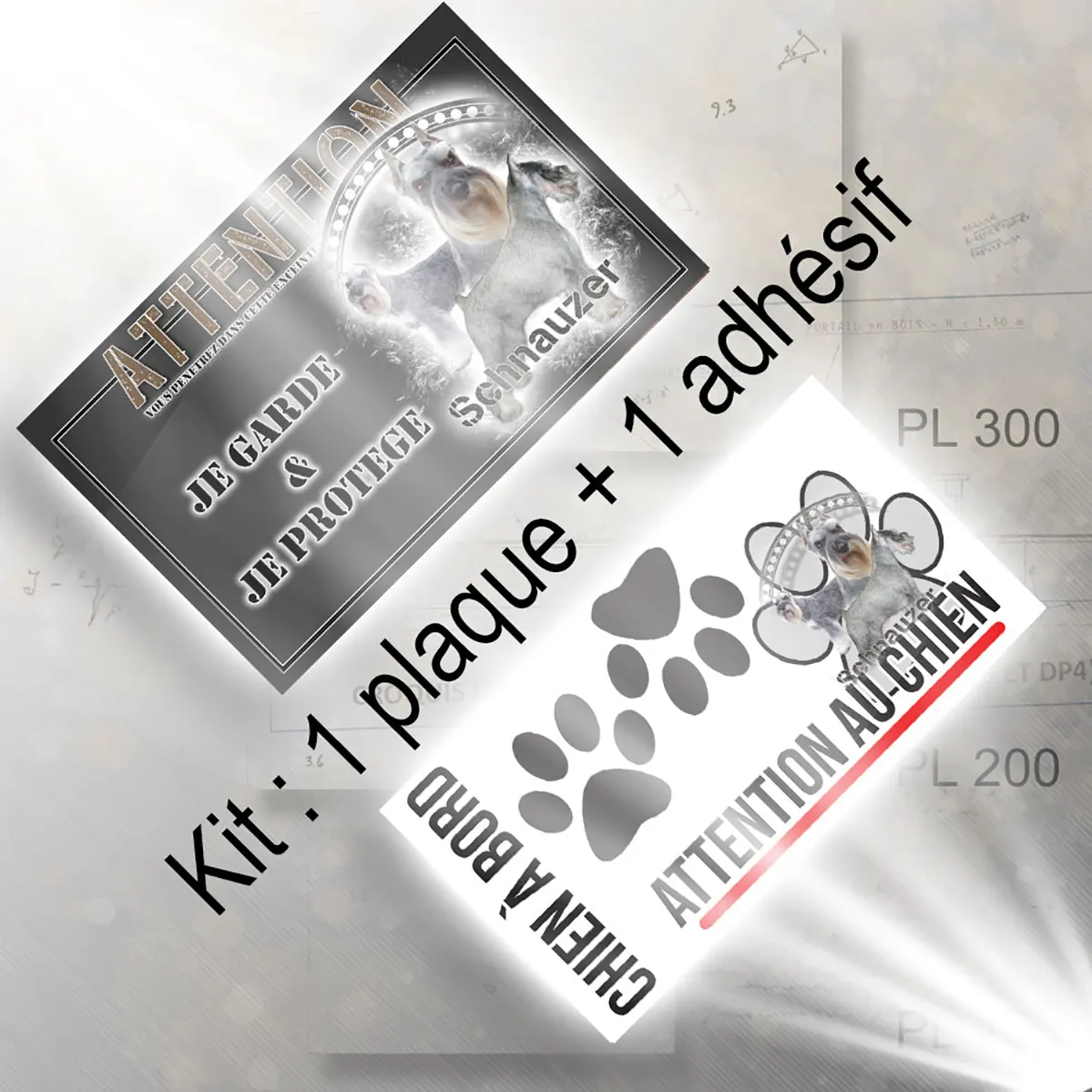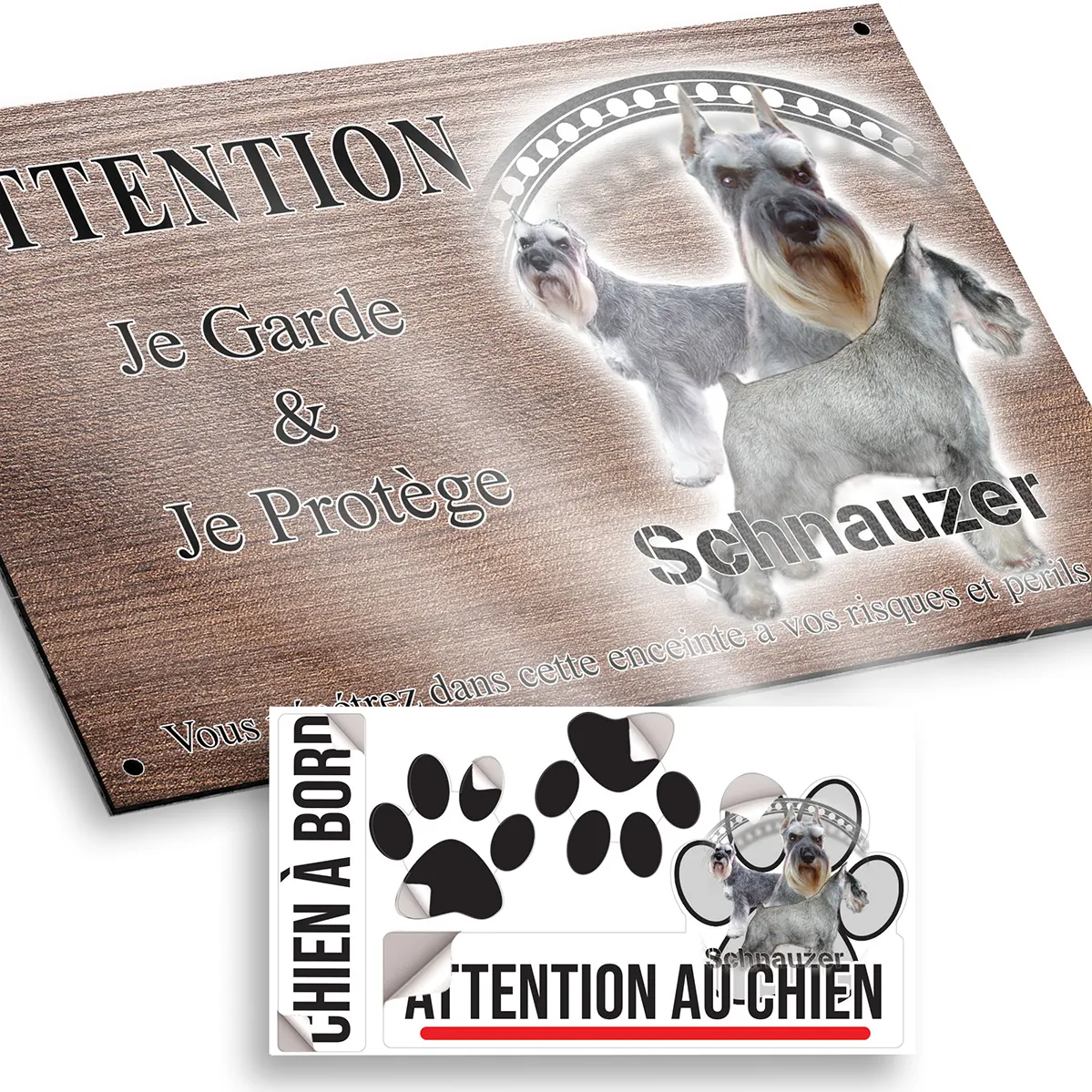 Pour en savoir plus sur notre gamme de plaque attention au chien schnauzer poivre et sel