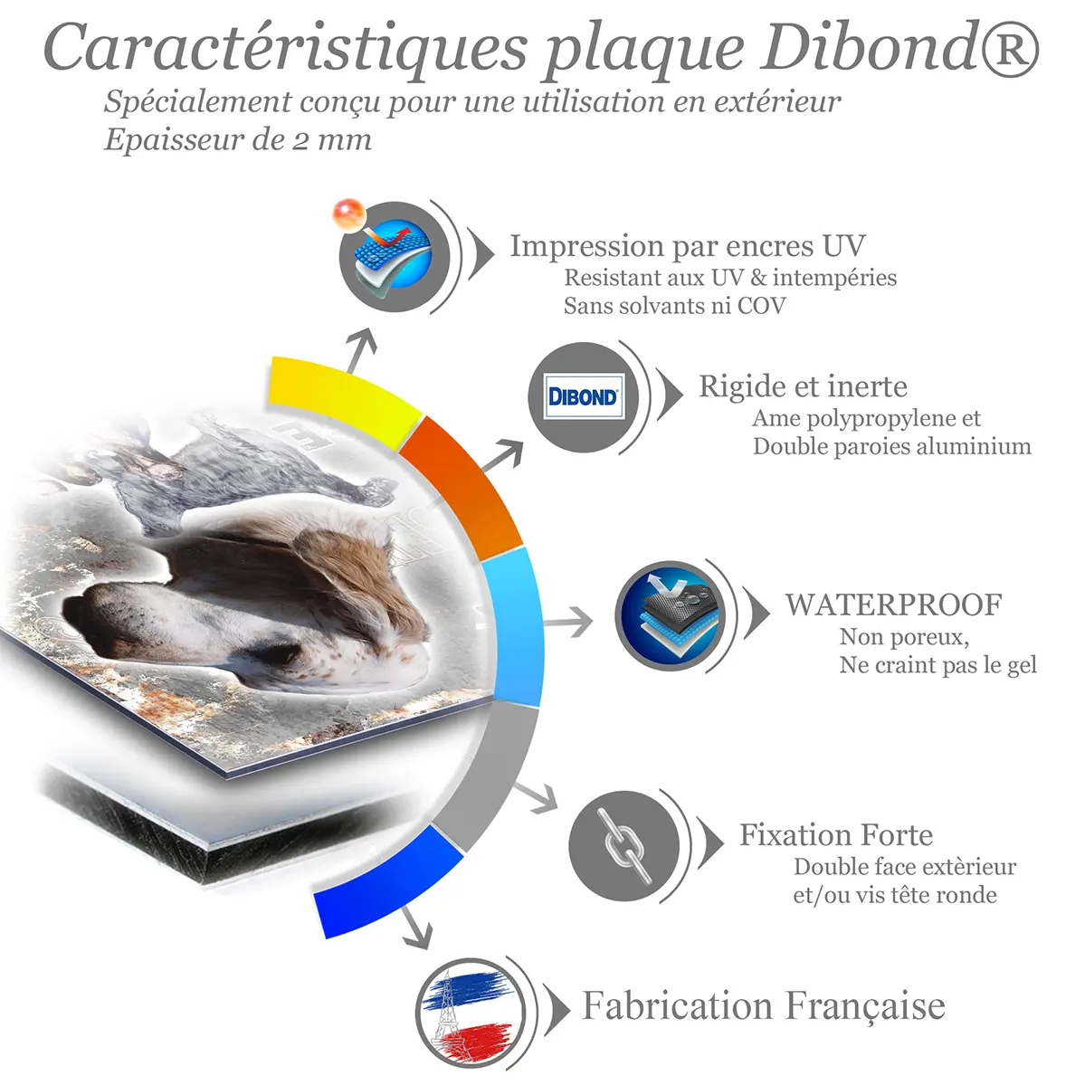 Oui, la plaque est fabriquée en aluminium Dibond de 2 mm et imprimée en UV. Elle ne craint ni la pluie, ni le soleil, ni le gel. Elle peut rester fixée dehors toute l’année sans perdre ses couleurs.