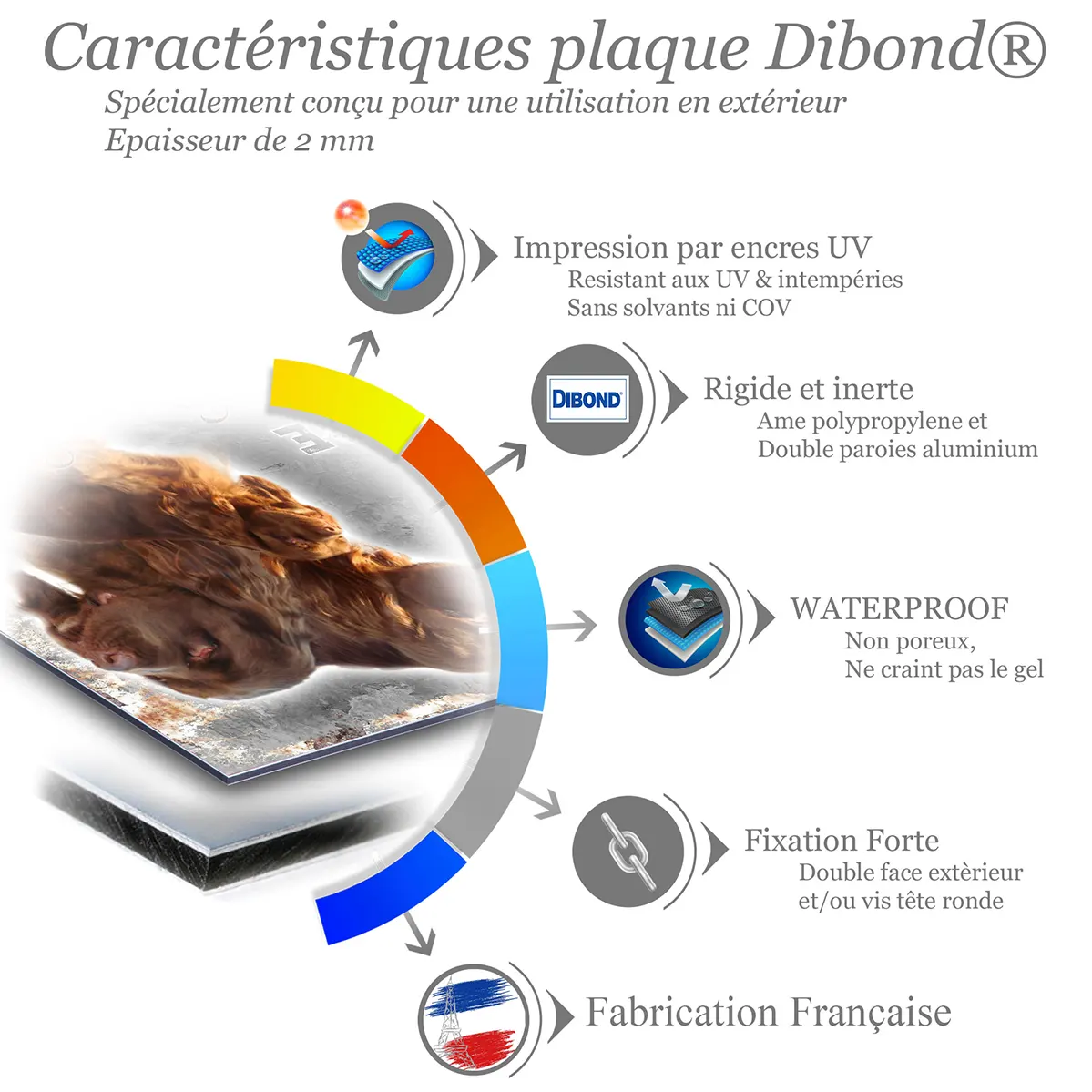 Oui, la plaque est fabriquée en aluminium Dibond de 2 mm et imprimée en UV. Elle ne craint ni la pluie, ni le soleil, ni le gel. Elle peut rester fixée dehors toute l’année sans perdre ses couleurs.