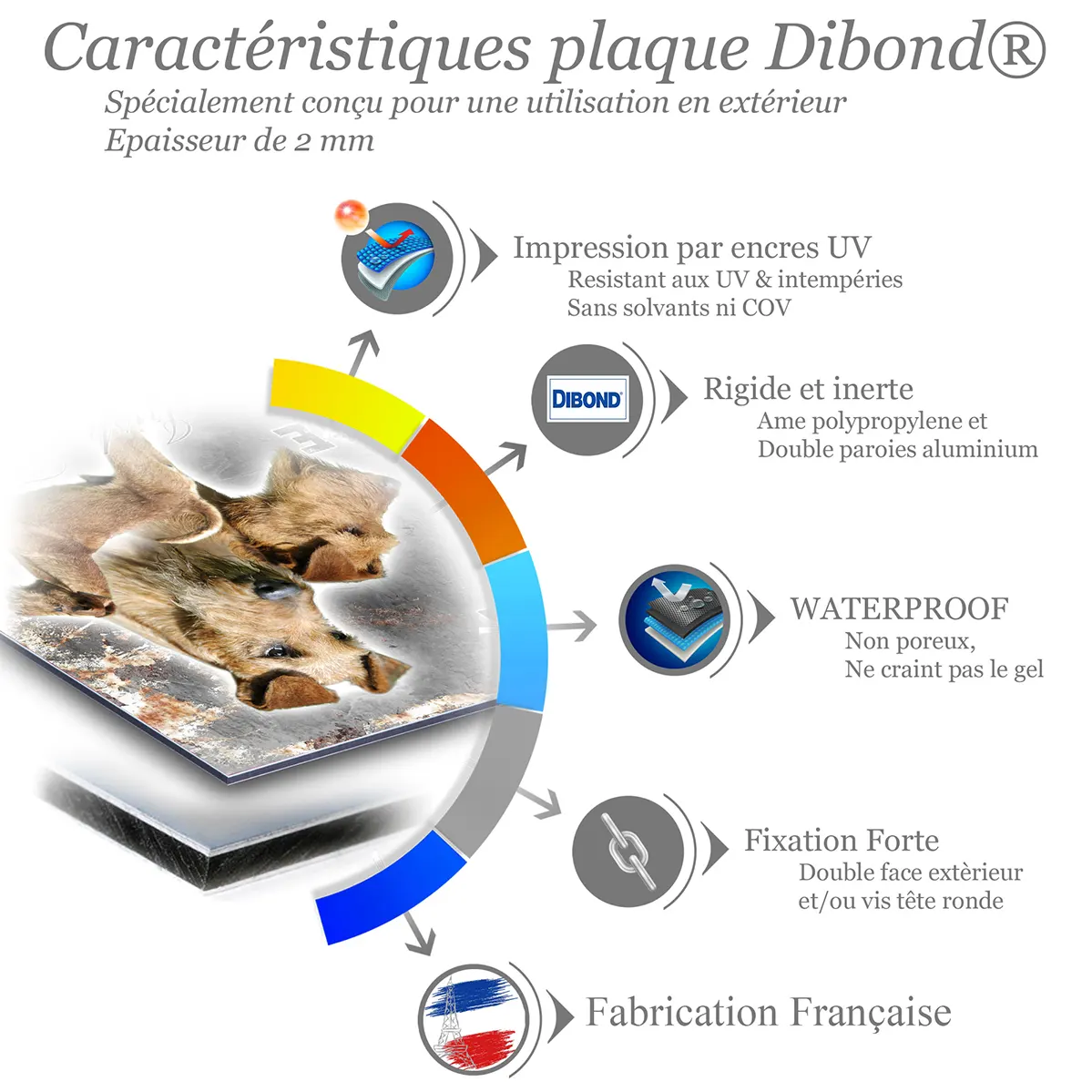 Oui, la plaque est fabriquée en aluminium Dibond de 2 mm et imprimée en UV. Elle ne craint ni la pluie, ni le soleil, ni le gel. Elle peut rester fixée dehors toute l’année sans perdre ses couleurs.