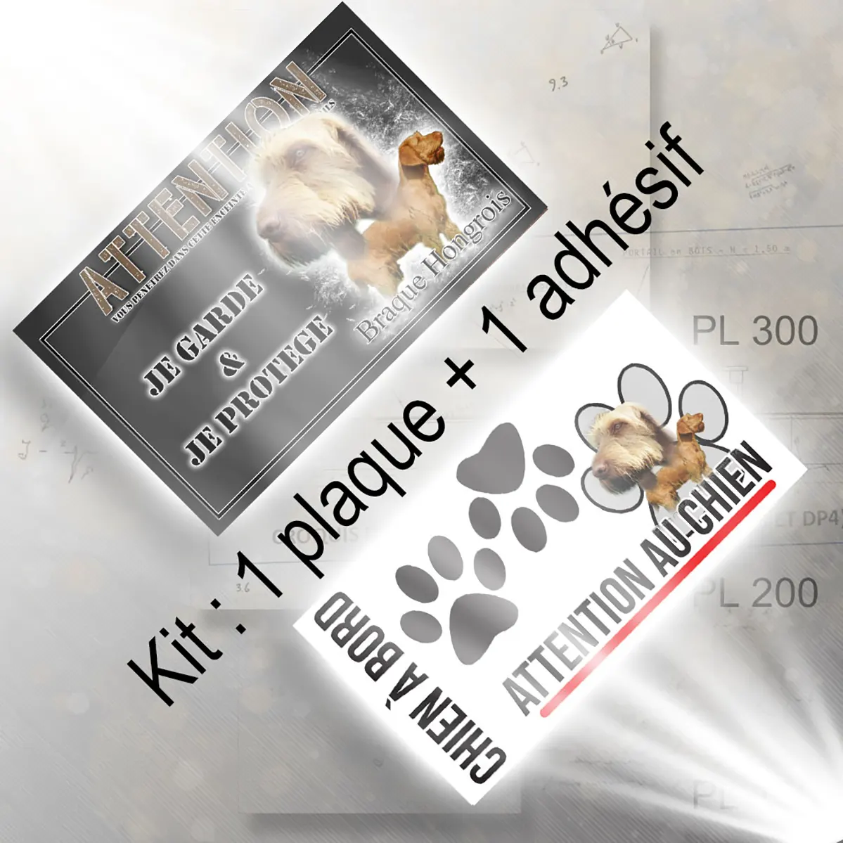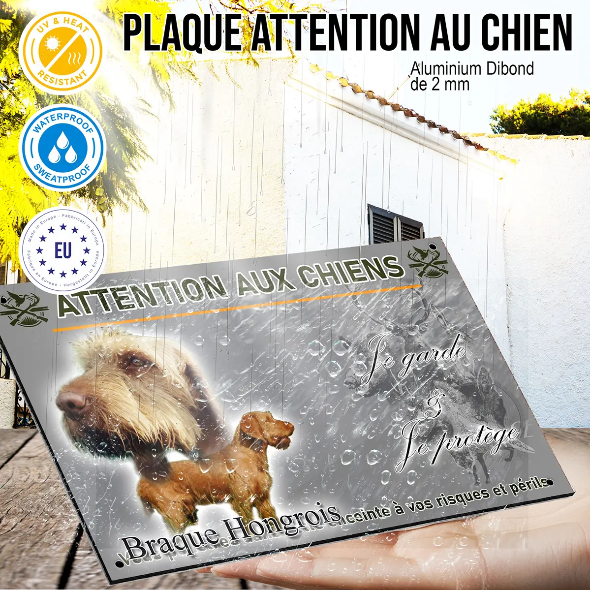 Ce visuel présente un Braque Hongrois en gros plan avec une tête distincte et un chien entier en arrière-plan. Le fond est flou, mettant en valeur les chiens. Le premier chien a un pelage long et soyeux, tandis que l’autre est plus court avec des nuances de brun. Cette plaque Attention au chien vizla devient un élément décoratif unique pour votre portail ou votre clôture. Elle combine esthétisme et fonctionnalité, tout en valorisant la noblesse et la prestance de votre compagnon.