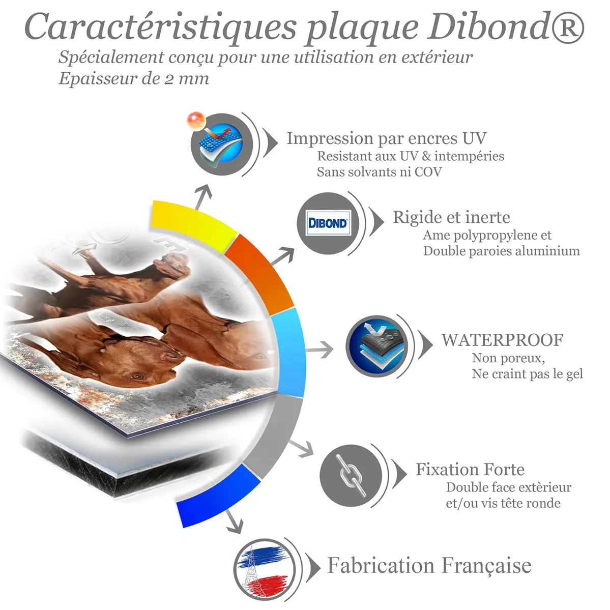 Oui, la plaque est fabriquée en aluminium Dibond de 2 mm et imprimée en UV. Elle ne craint ni la pluie, ni le soleil, ni le gel. Elle peut rester fixée dehors toute l’année sans perdre ses couleurs.