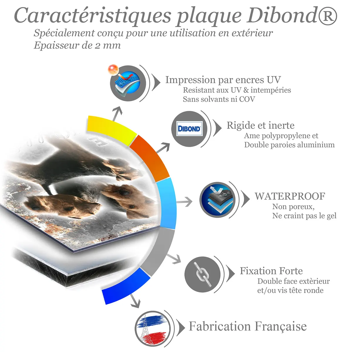 Oui, la plaque est fabriquée en aluminium Dibond de 2 mm et imprimée en UV. Elle ne craint ni la pluie, ni le soleil, ni le gel. Elle peut rester fixée dehors toute l’année sans perdre ses couleurs.