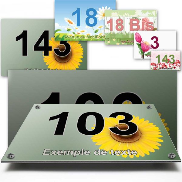 Comme l’illustre parfaitement l’image de la plaque avec le numéro « 86 » et le motif de tournesol, la personnalisation atteint des sommets. Le visuel met en avant l’intégration du numéro de maison et du texte de votre choix, avec des effets visuels et polices à l’identique, assurant une cohérence graphique parfaite.